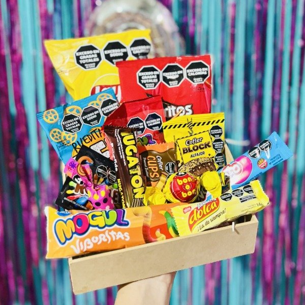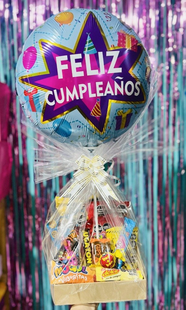 Bandeja de 20x21x8cm acompañada de dulces, chocolates y snacks + Globo Feliz cumpleaños (el modelo del globo puede modificarse según stock disponible)